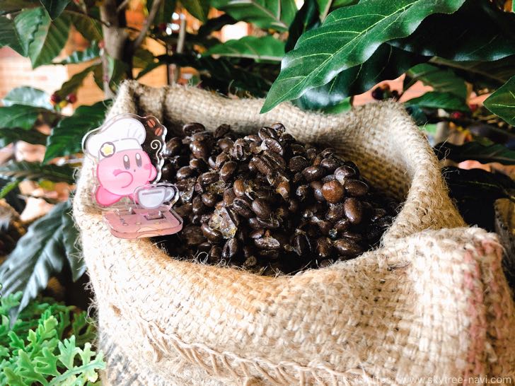 コーヒーの麻袋の目の前でコーヒーを楽しむカービィ。