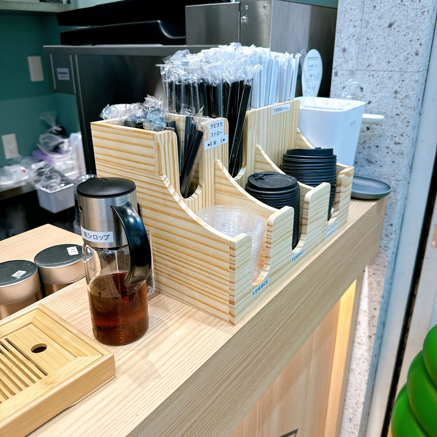 ドリンクの蓋やストローなどの準備はセルフサービス。自分が注文したメニューにぴったりのアイテムを選びましょう。