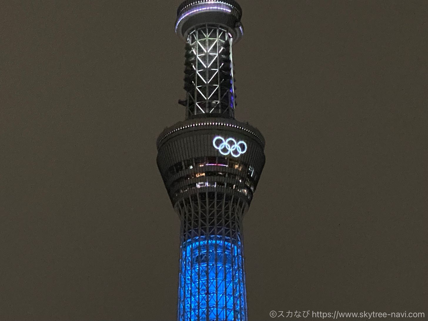 開催期間中、東京スカイツリーではオリンピックのシンボルカラーの特別ライティングと、オリンピックシンボル「Five Rings(ファイブリングス)」のレーザーマッピング投影が行われます。