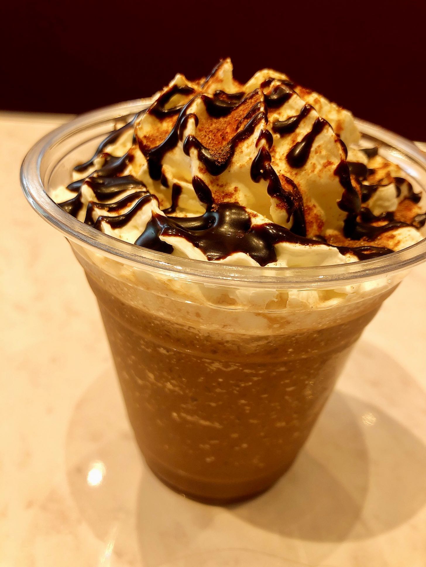 濃厚リッチフラッペチョコレートは、スタバのフラペチーノのようなドリンクで、チョコ味のフラッペ(氷)にホイップクリームがたっぷり、さらにチョコレートソースもたーっぷりかかっています。
